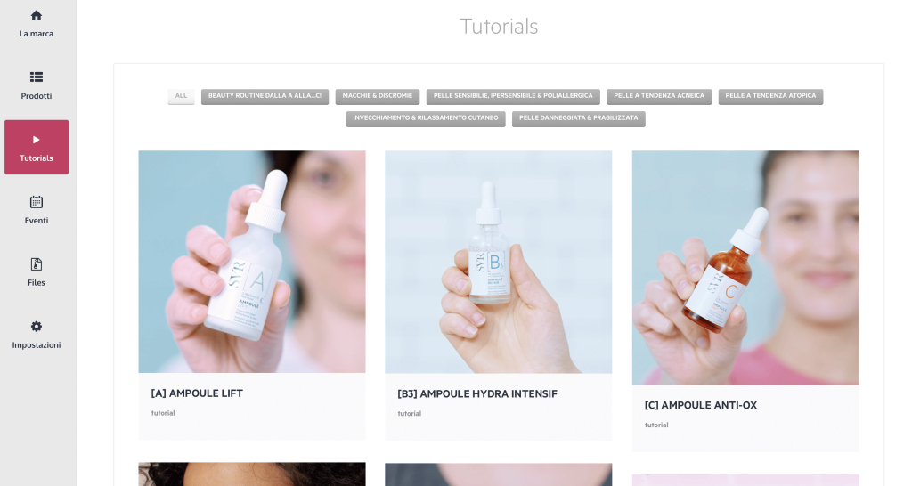 - Upload Video: possibilità di caricare dei video e taggare un prodotto e/o evento per ricerca ad-hoc.
